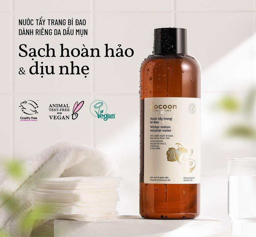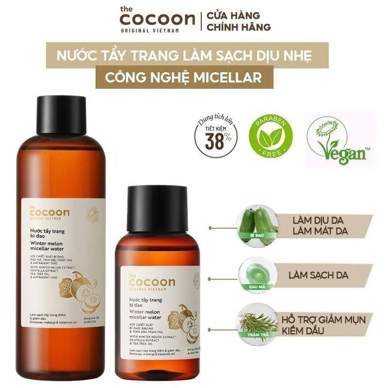 Nước Tẩy Trang Làm Sạch Dịu Nhẹ Chiết Xuất Bí Đao Cocoon Winter Melon Micellar Water là nước tẩy trang với công nghệ micellar, nước tẩy trang bí đao giúp làm sạch hiệu quả lớp trang điểm, bụi bẩn và dầu thừa mang lại làn da sạch mịn và dịu nhẹ, rất phù hợp với làn da dầu mụn, kể cả với làn da nhạy cảm thuộc thương hiệu mỹ phẩm thuần chay Cocoon đến từ Việt Nam.