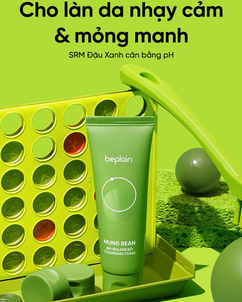 - Sữa Rửa Mặt Chiết Xuất Đậu Xanh Cân Bằng Độ pH Beplain Mung Bean pH-Balanced Cleansing Foam hiện đã có mặt giúp làm sạch sâu, làm sạch lớp trang điểm và bụi bẩn bám trên da, tẩy tế bào chết nhẹ nhàng cho làn da ẩm mượt, sáng mịn.