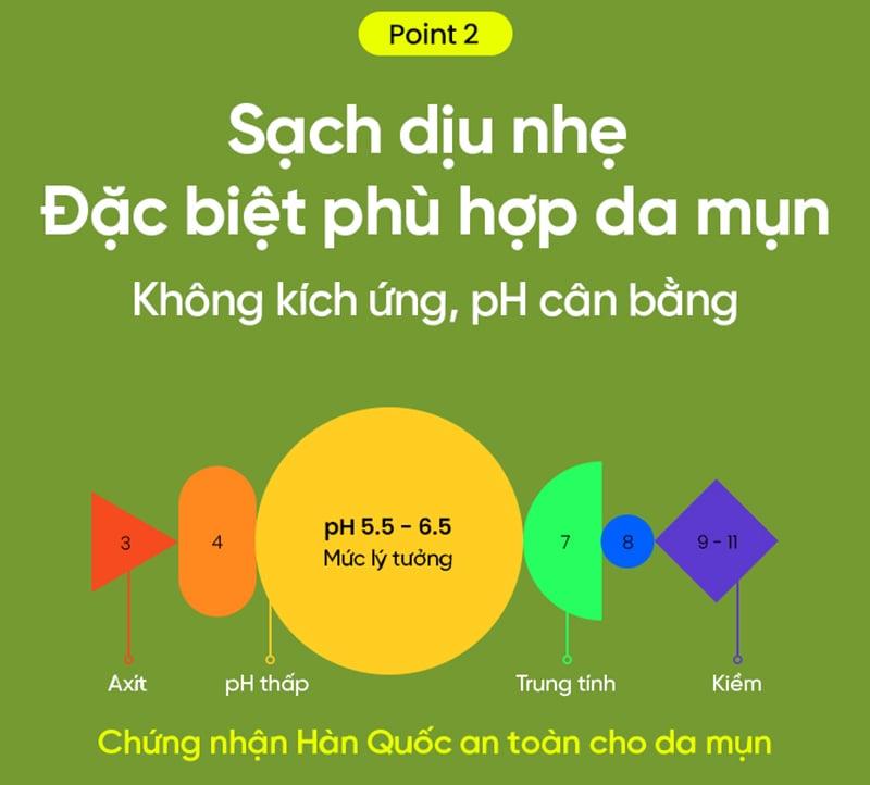 - Độ pH chuẩn: Chỉ từ 5.5 đến 6.5 giúp bảo vệ hàng rào tự nhiên của da